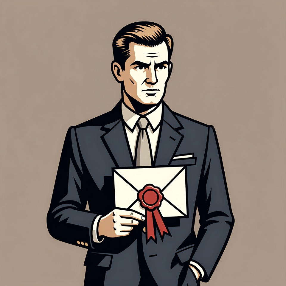 A stylized illustration of a man in a dark suit and tie stands confidently on a beige background. He holds a white envelope sealed with red wax and ribbon in his right hand. His hair is neatly combed back, and he has a serious expression.