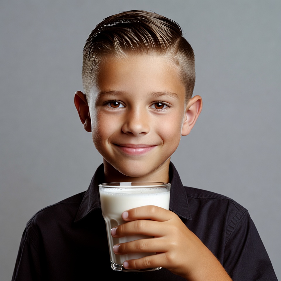 A young boy with short light brown hair and a friendly smile holds a tall glass of milk in his hands. He wears a black collared shirt and stands against a plain gray background. His eyes look directly at the camera with a cheerful expression.
