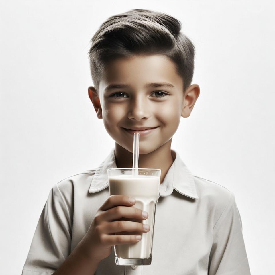 A young boy with short dark hair smiles while holding a tall glass of creamy milkshake with a straw. He wears a light-colored collared shirt and stands against a plain white background. His eyes are focused forward as he drinks from the glass.