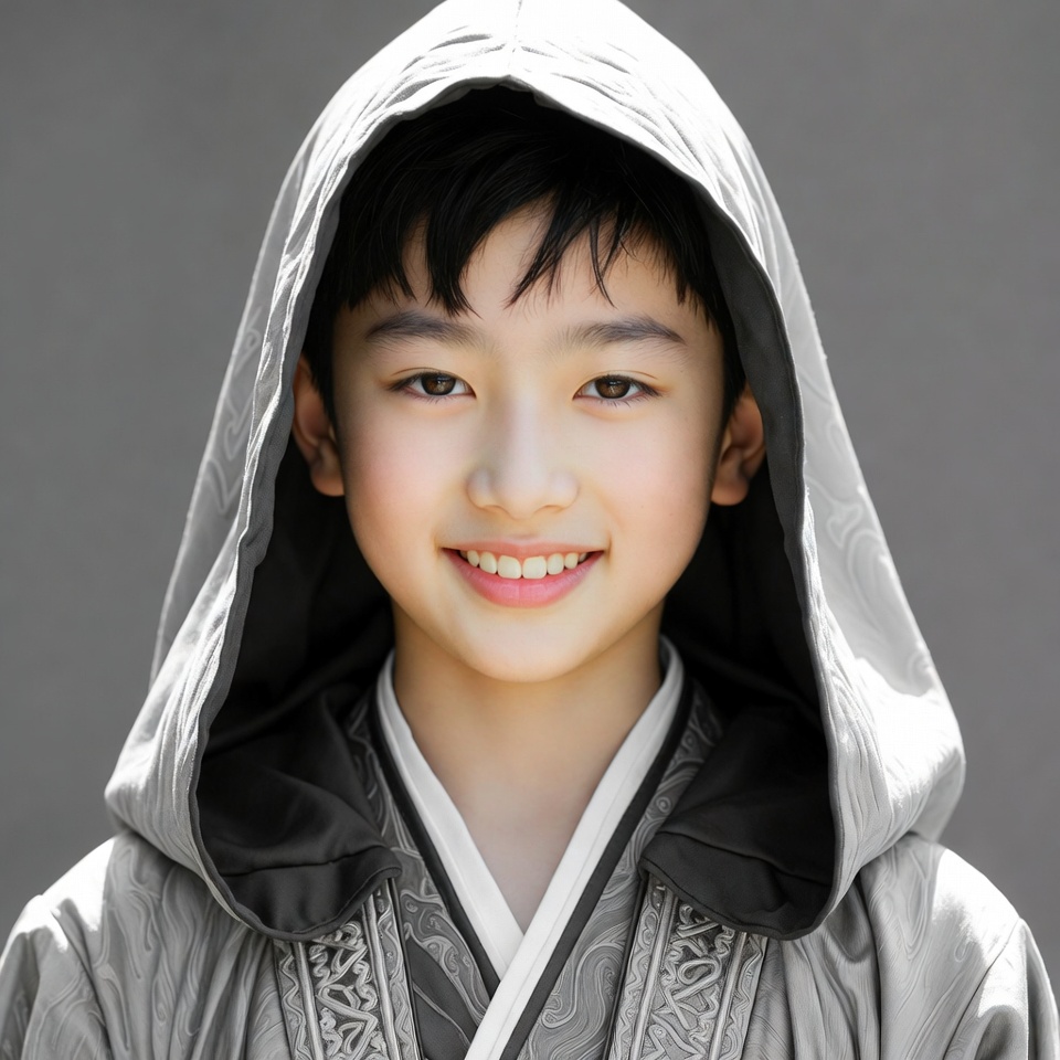 A young Asian boy with short black hair smiles happily while wearing a traditional gray hanfu robe with intricate embroidery. He has the hood up, framing his face against a plain gray background. The white collar of the hanfu contrasts with the dark hood lining.