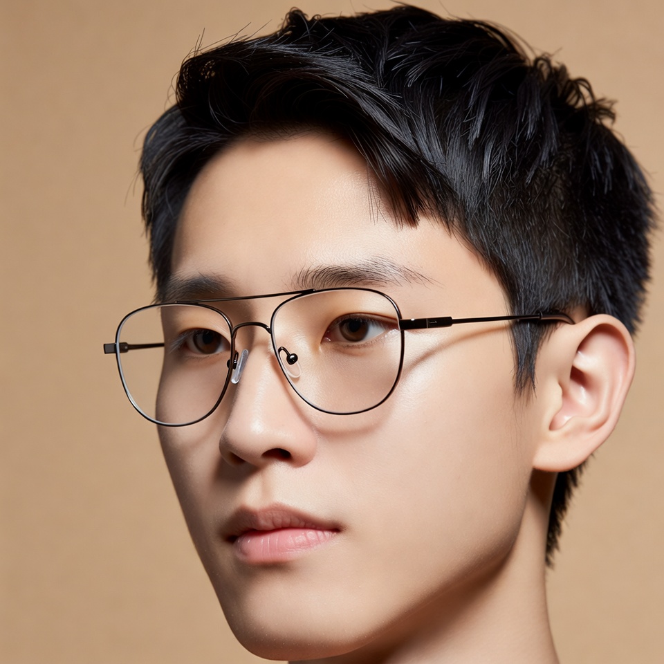 Asian, Asian man, East Asian, aviator glasses, beige background, black hair, brown eyes, close-up, eyeglasses, glasses, headshot, male, metal glasses, neutral expression, portrait, short hair, stylish glasses, young male, young man, man