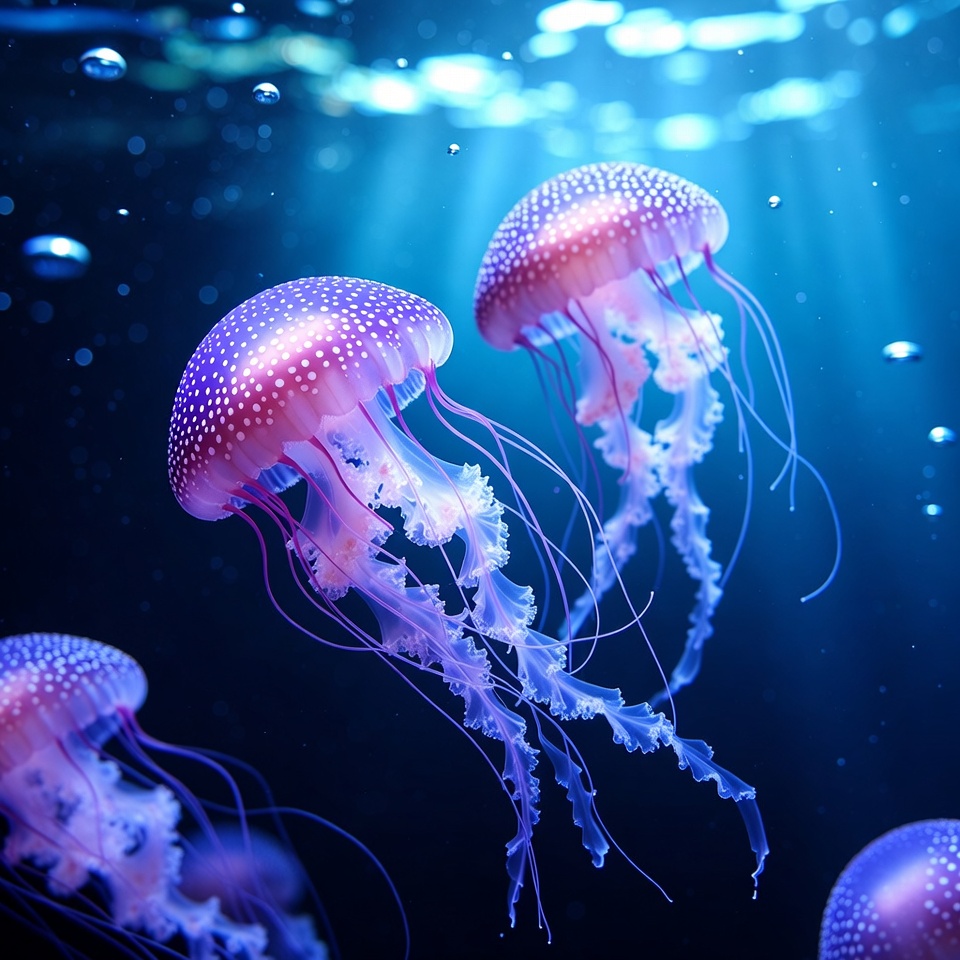 Several vibrant jellyfish with purple, pink, and blue hues float gracefully in deep blue ocean water. Bubbles surround them, and their translucent bells are dotted with white spots while long tentacles trail below. The scene captures a serene underwater environment with glowing light effects.