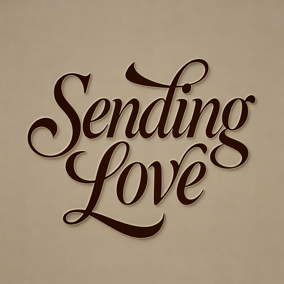 Elegant brown cursive text reads 'Sending Love' on a beige background. The lettering features swirling, calligraphic flourishes with a glossy, shadowed effect. It is isolated against the solid tan backdrop.