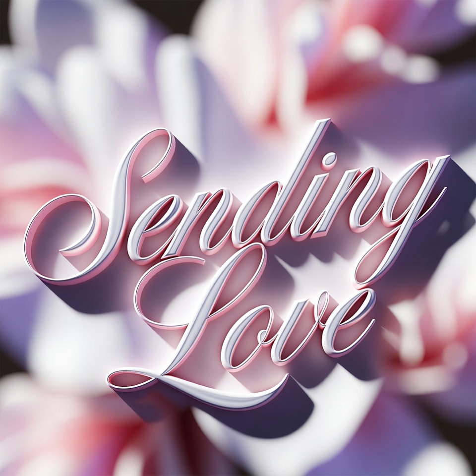 Elegant 3D text reading 'Sending Love' in white cursive font with pink glow and shadows. Surrounded by blurred pink and white flowers on a dark background. The design features a romantic, glossy metallic effect.