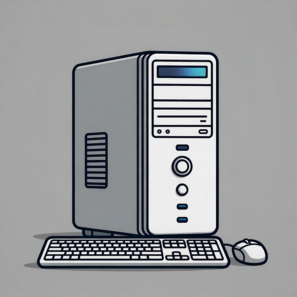 A minimalist line art illustration of a desktop computer tower on a gray background. The white PC case features a glowing blue power light, vents, and buttons on the front. A keyboard and white computer mouse sit in front of the tower.