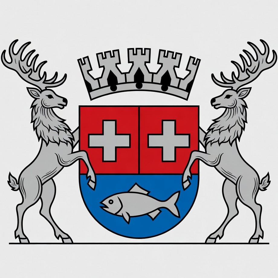 A heraldic coat of arms features a red shield with a white cross, topped by a golden mural crown. Two silver deer with large antlers stand on either side, supporting the shield. The bottom section is blue with a silver fish.