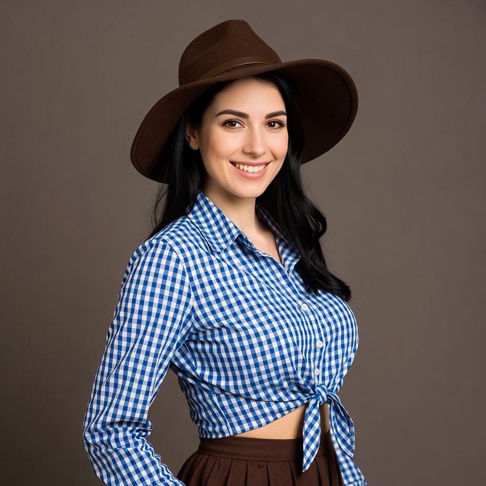 A smiling woman with long dark wavy hair stands against a gray background. She wears a wide-brimmed brown hat, a blue checkered button-up shirt tied at the waist, and a brown pleated skirt. She poses confidently with her hands on her hips.