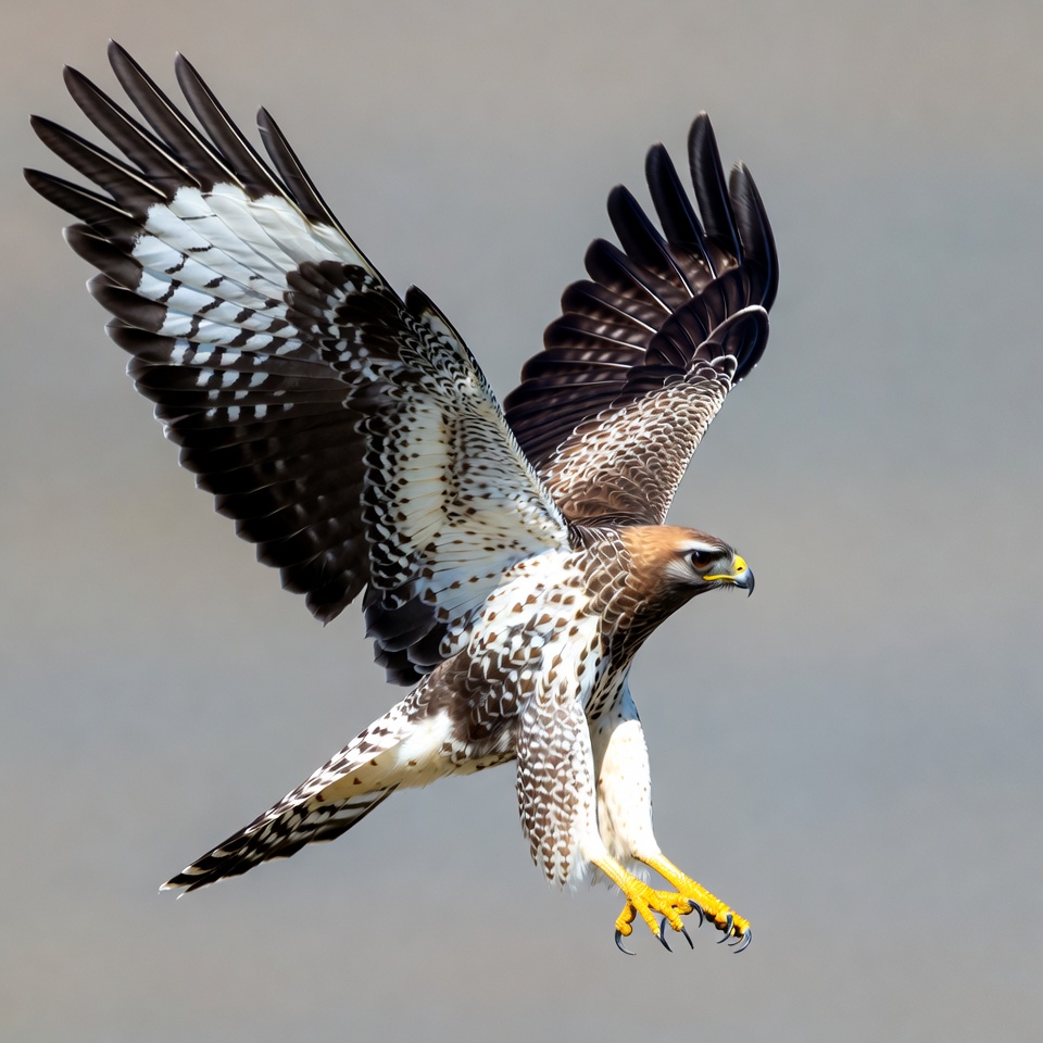 animal, bird, bird of prey, brown body, feathers, flying, hawk, isolated background, raptor, soaring, speckled wings, talons, white underwing, wildlife, wings spread, yellow beak, red-tailed hawk