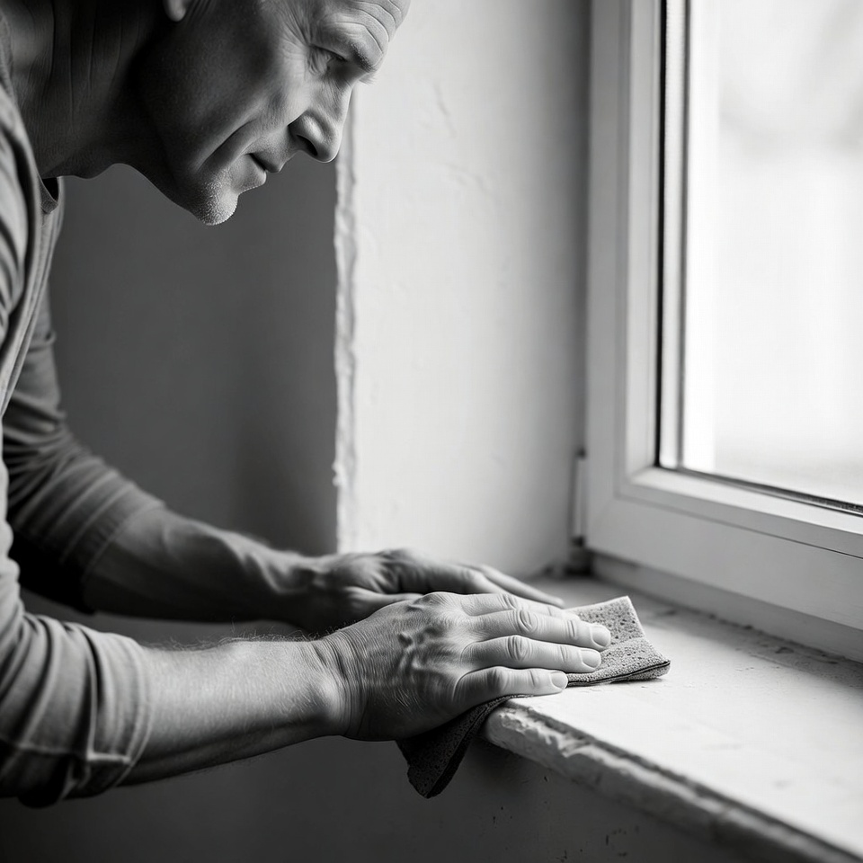An older man with short hair leans forward to clean a window using a cloth in his hands. He wears a light-colored shirt and focuses on wiping the windowsill. The image is in black and white with soft lighting.