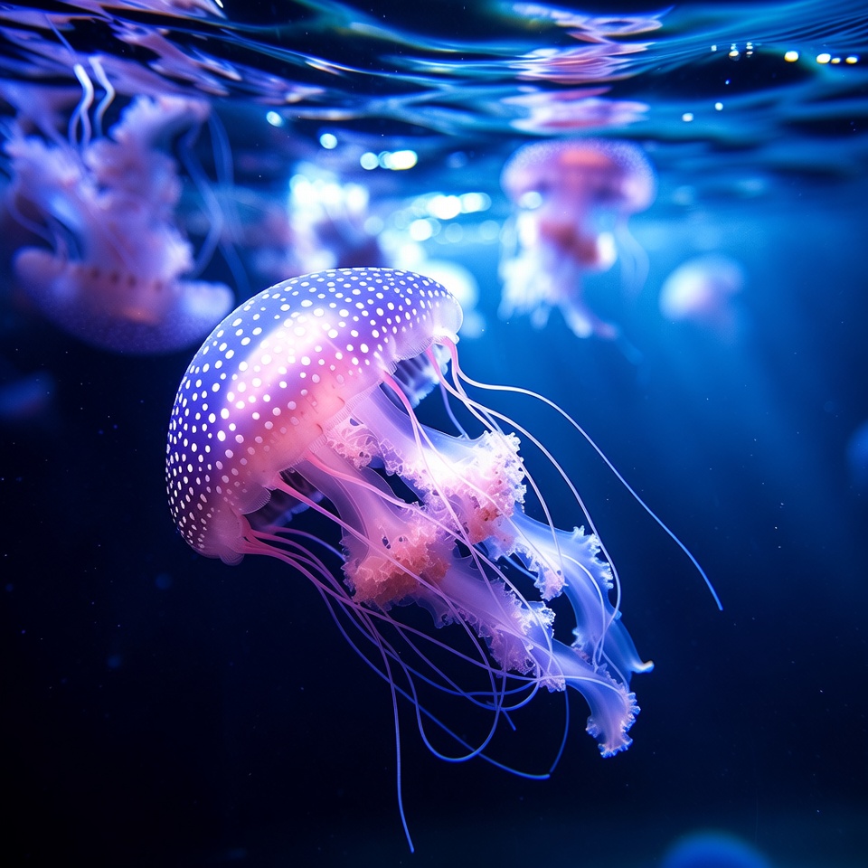 aquatic, bioluminescent, blue water, bubbles, cluster, deep sea, floating jellyfish, glowing, marine life, ocean, pink jellyfish, polka dot jellyfish, sea creatures, spotted jellyfish, tentacles, translucent, underwater, jellyfish