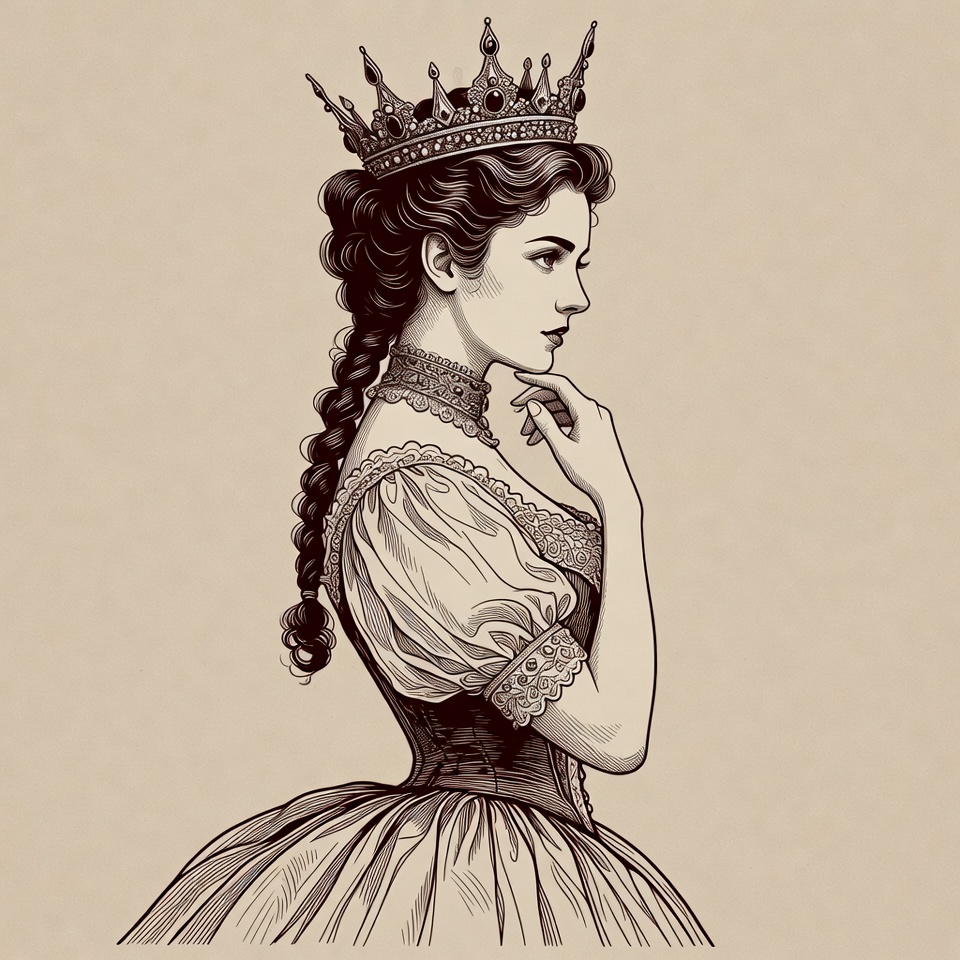 A detailed line art illustration depicts a woman in profile wearing an ornate crown and Victorian-era gown with lace details and puffed sleeves. She has long braided hair and rests her finger on her chin in a thoughtful pose. The artwork features intricate shading on a beige background.