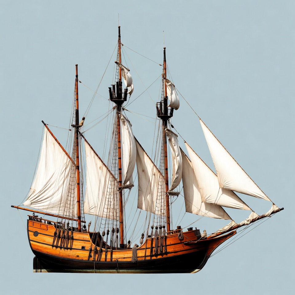 A detailed wooden sailing ship with three masts and white sails is depicted against a solid light blue background. The ship features orange-brown hull, black rigging, and billowing sails. It appears isolated and ready to sail.