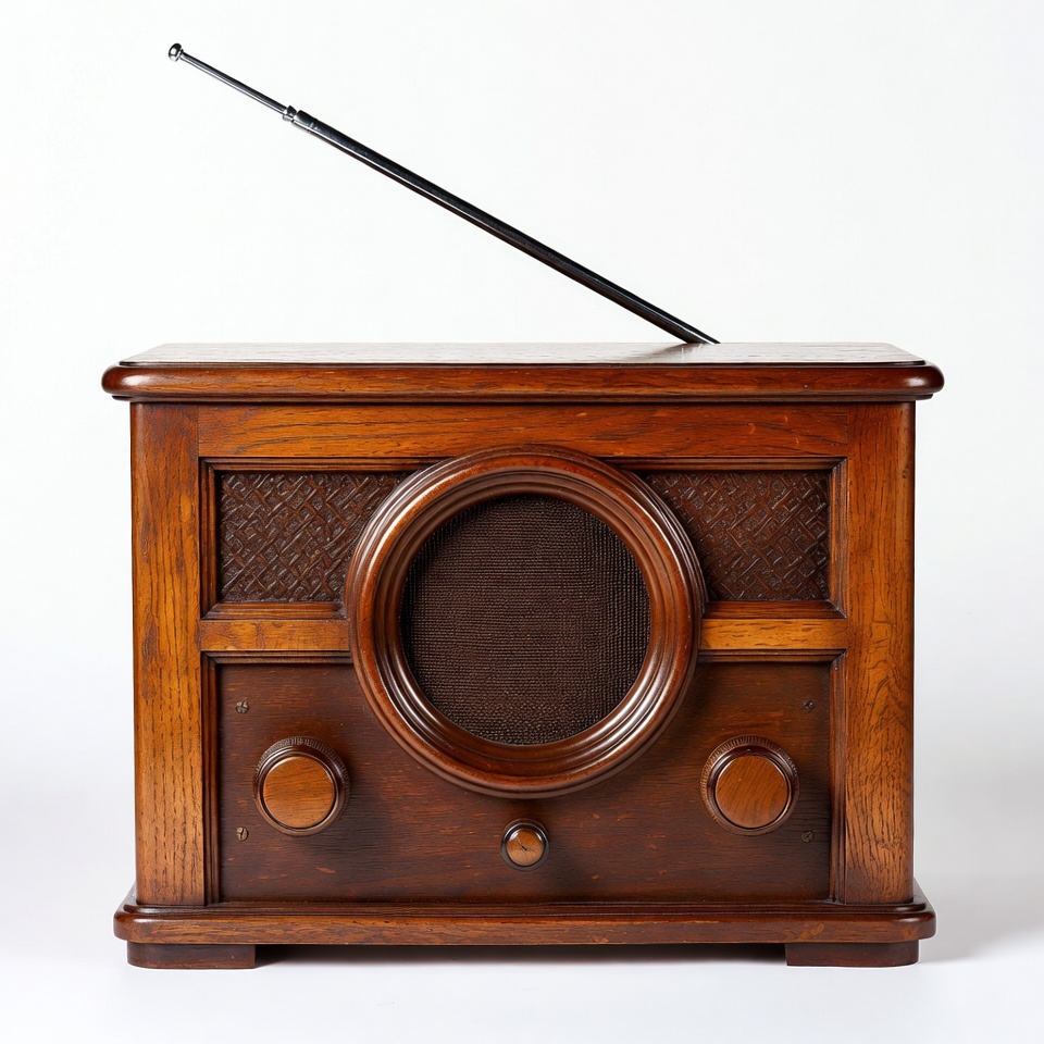 antique radio, isolated background, oak radio, old radio, radio antenna, retro radio, speaker grille, tuning knobs, wooden radio, vintage radio