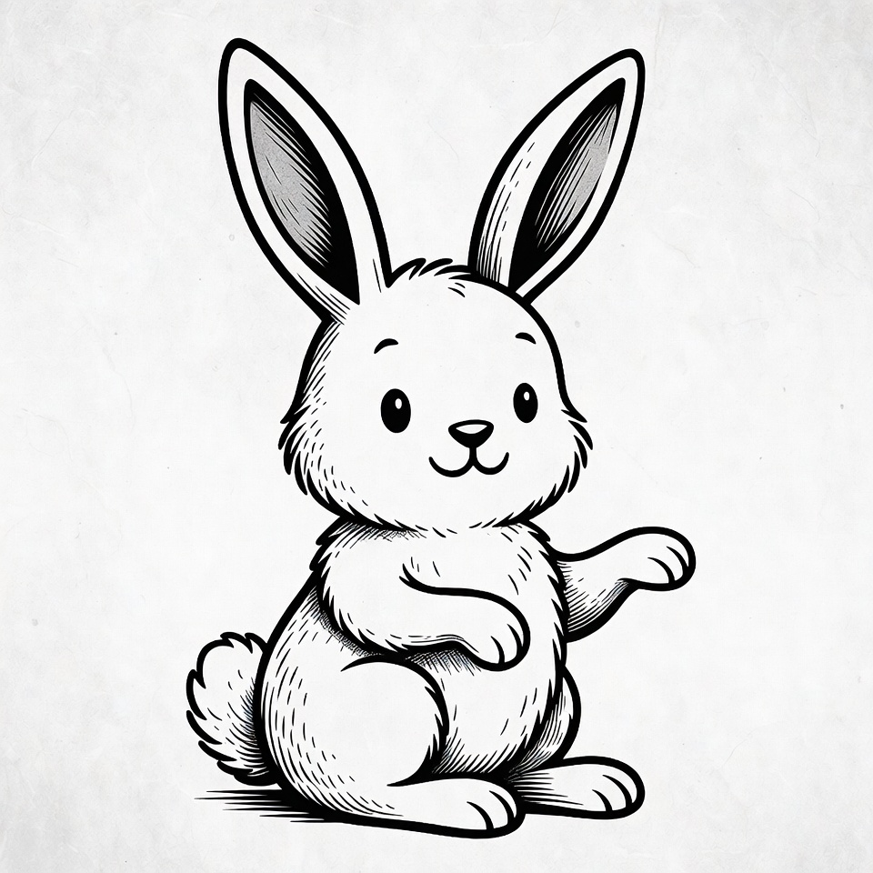 adorable rabbit, animal illustration, big ears, black and white, cartoon bunny, clipart, cute bunny, fluffy fur, happy rabbit, illustration, isolated background, kawaii rabbit, line art, paw raised, rabbit, sitting bunny, smiling bunny, vector bunny, waving bunny, bunny