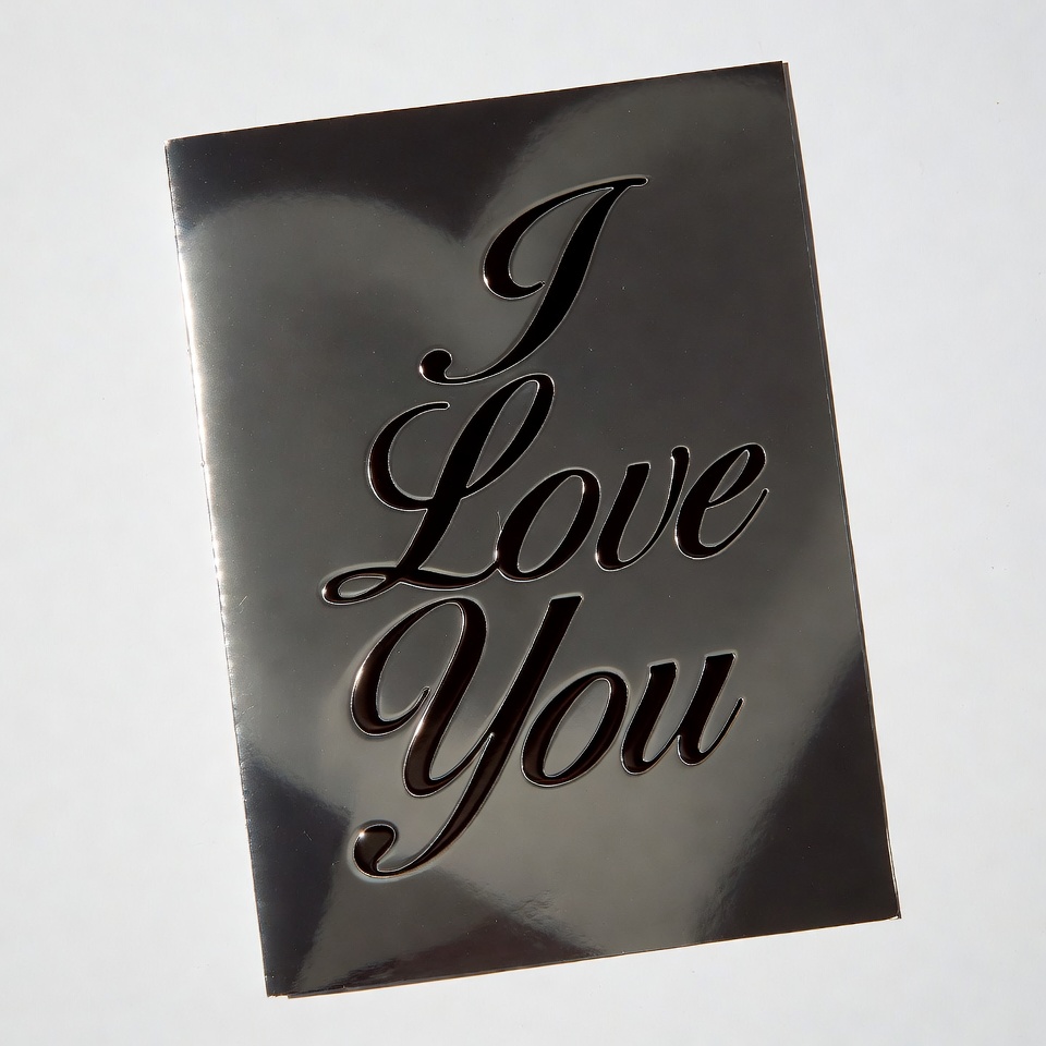cursive font, embossed text, greeting card, heart card, heart shape, isolated background, love card, metallic card, romantic card, shiny card, silver card, valentine card, I love you