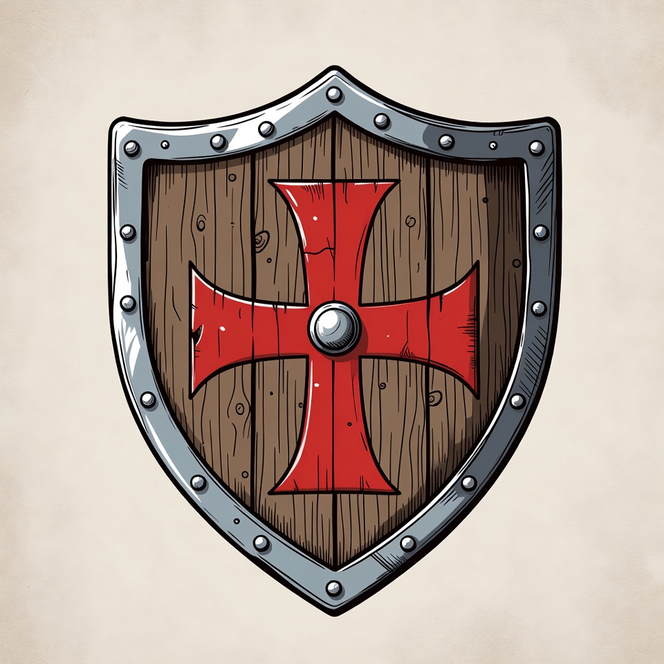 An illustration of a medieval wooden shield with metal trim features a bold red cross pattée in the center. The shield has a textured wooden surface and silver rivets along the edges. It is depicted on a beige background.