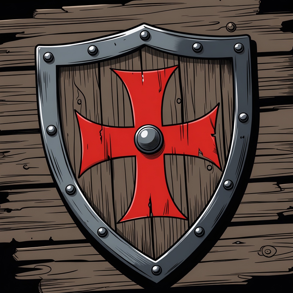 cartoon illustration, clipart, cross symbol, crusader shield, fantasy shield, graphic design, heraldry, isolated background, knight shield, medieval shield, metal edges, red cross, red symbol, rivets, symbol, vector art, wooden background, shield
