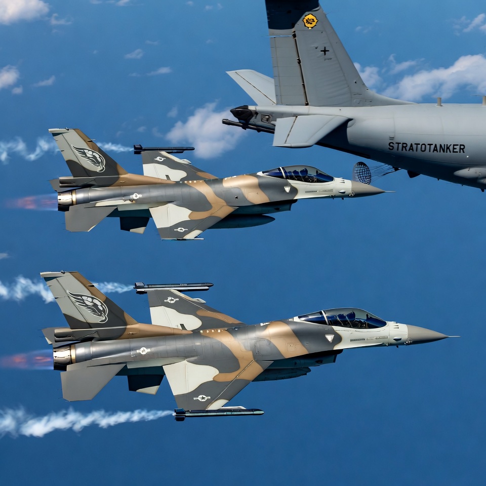 Two F-16 fighter jets with gray and tan camouflage are flying alongside a large KC-135 Stratotanker aircraft in a clear blue sky. The jets are connected via refueling booms, with visible exhaust trails and cockpit details. The Stratotanker displays military markings on its fuselage.