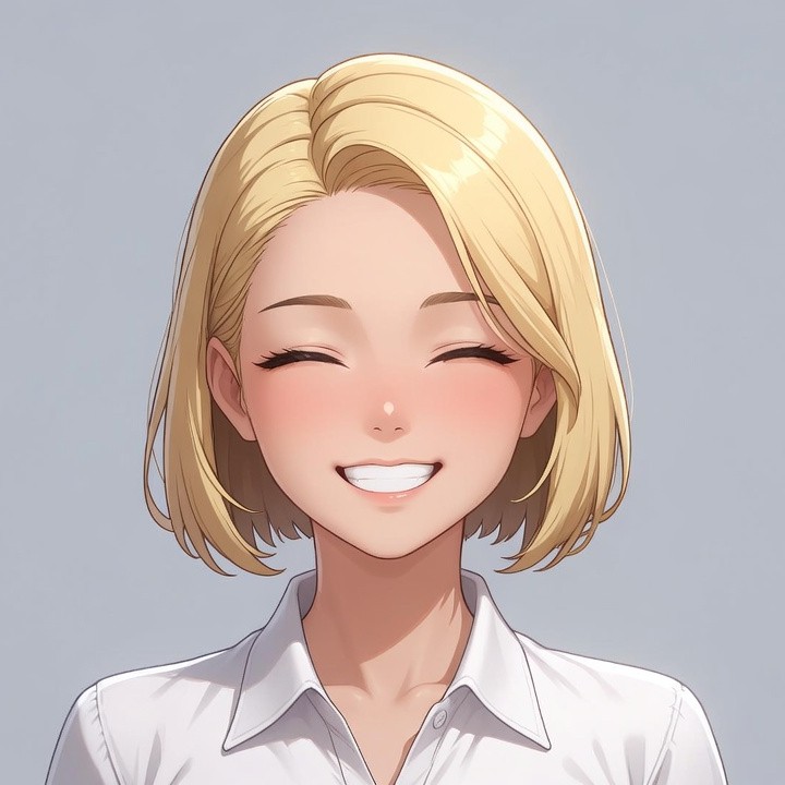 A cute anime girl with straight blonde bob hair smiles brightly with closed eyes and blushing cheeks. She wears a white collared shirt and faces forward against a plain light blue background. Her expression radiates joy with visible teeth and flushed skin.