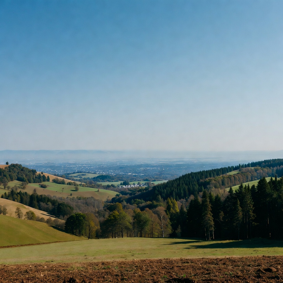 aerial view, autumn trees, blue sky, city view, countryside, evergreen trees, forests, green fields, hills, horizon, nature, outdoors, panoramic, plowed field, rolling hills, rural, scenery, trees, valley, landscape