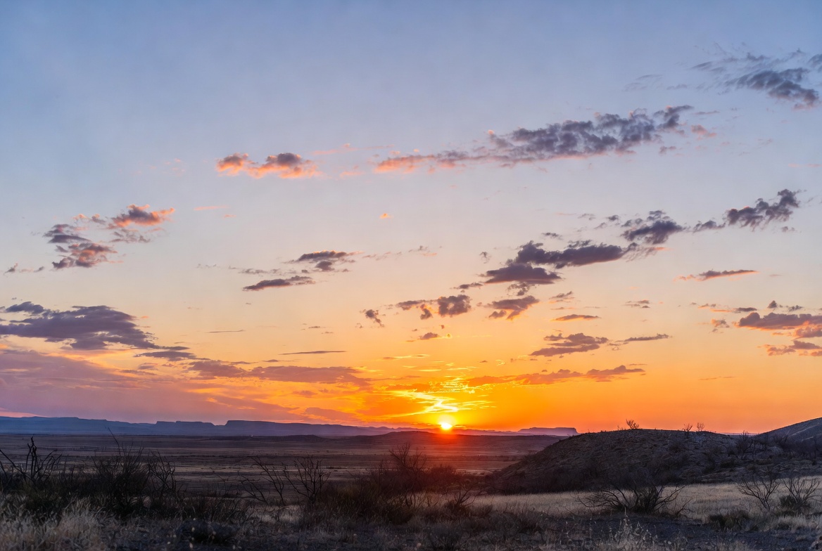 arid, bushes, clouds, desert, dusk, golden hour, horizon, landscape, mountains, nature, orange sky, outdoor, panorama, purple sky, rocks, scenery, scenic view, sky, sun, terrain, travel, vibrant colors, wilderness, sunset