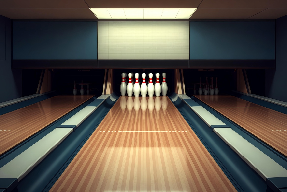 alley interior, blue gutters, bowling alley, bowling lane, bowling setup, bright lights, dim background, empty lane, glossy wood, indoor sports, overhead light, pins standing, polished floor, recreation, scoring table, sports equipment, ten pins, white screen, wooden lane, bowling pins