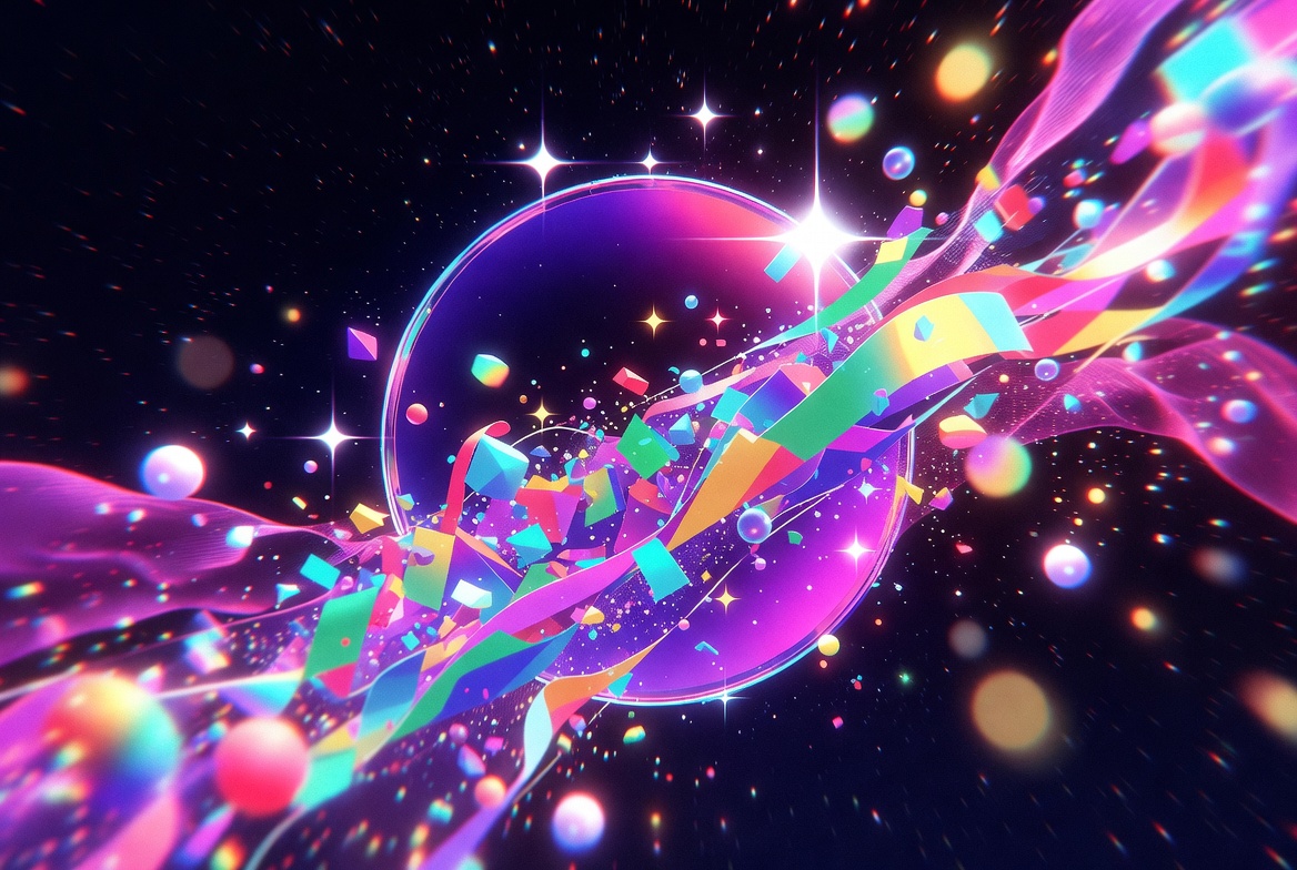 A digital illustration features a large purple bubble at the center surrounded by colorful geometric shapes and fragments in pink, yellow, green, and blue. Shiny stars, bubbles, and flowing ribbons scatter across a dark starry background. The vibrant synthwave design bursts with neon energy and glossy reflections.
