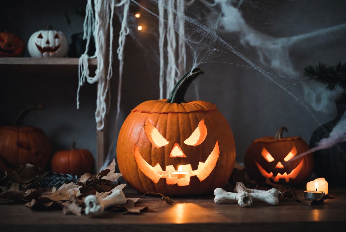 Halloween, Halloween decoration, autumn leaves, bones, candle, carved face, carved pumpkin, cobwebs, dark background, evil grin, fall decor, glowing pumpkin, holiday props, jack-o-lantern face, misty fog, orange pumpkin, pumpkin, shelves, spider webs, spooky, string lights, wooden table, jack-o-lantern
