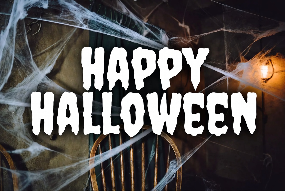 A spooky Halloween graphic features large white text reading 'Happy Halloween' draped in cobwebs. An old wooden chair sits in the dim background with a hanging lantern providing faint light. The scene has a dark, eerie atmosphere with tangled spider webs throughout.