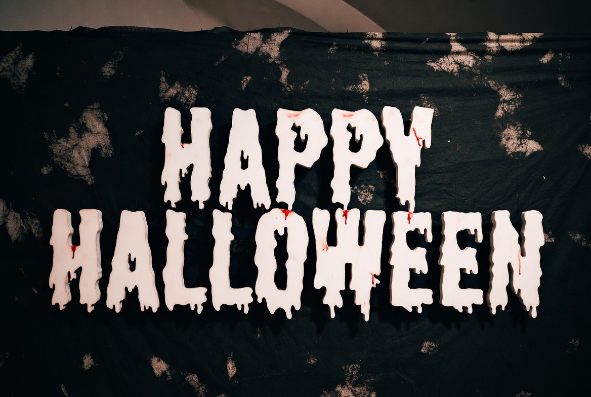 Halloween banner, Halloween decoration, Halloween party, Halloween sign, black background, dripping letters, drippy font, fabric banner, gothic text, holiday banner, isolated background, slime effect, spooky banner, white text, Happy Halloween