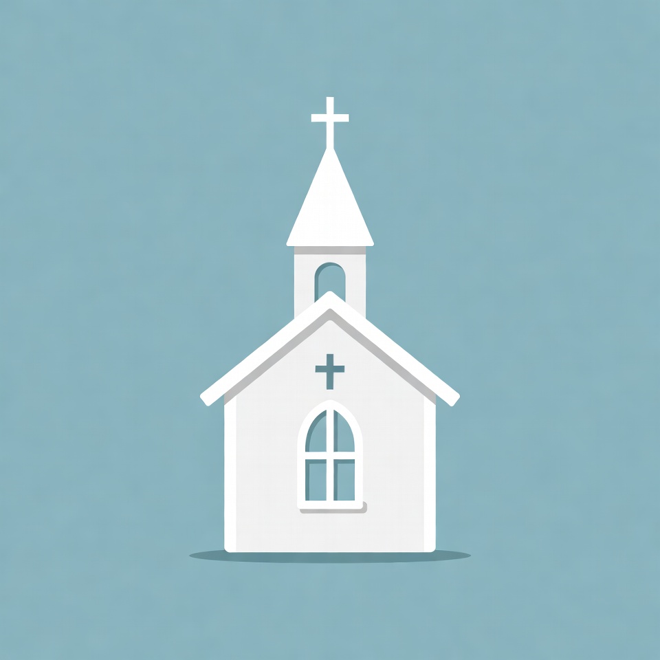 A simple white church illustration features a tall steeple topped with a cross on a light blue background. The church has arched windows and a cross on the front facade. It is depicted in a flat vector style with clean lines and subtle shadows.