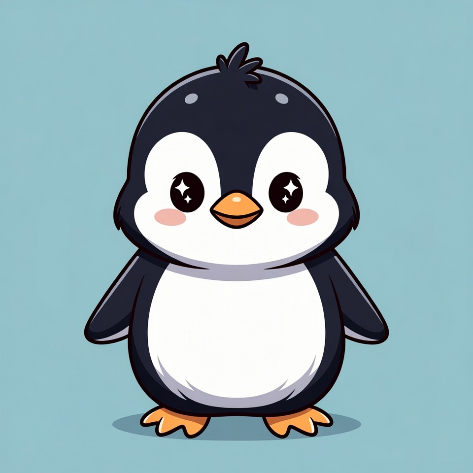 A kawaii-style cartoon penguin with black and white feathers stands on a light blue background. It has large sparkling eyes, rosy cheeks, and a small orange beak. The chubby penguin poses cutely with flippers at its sides.