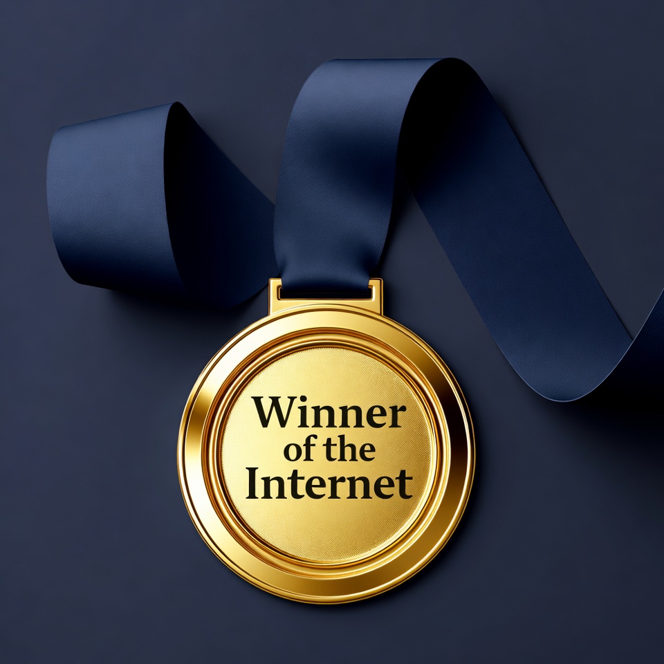 A shiny gold medal with 'Winner of the Internet' text hangs from a flowing navy blue ribbon. The medal features a circular design on a dark blue background. The ribbon drapes elegantly around the medal.