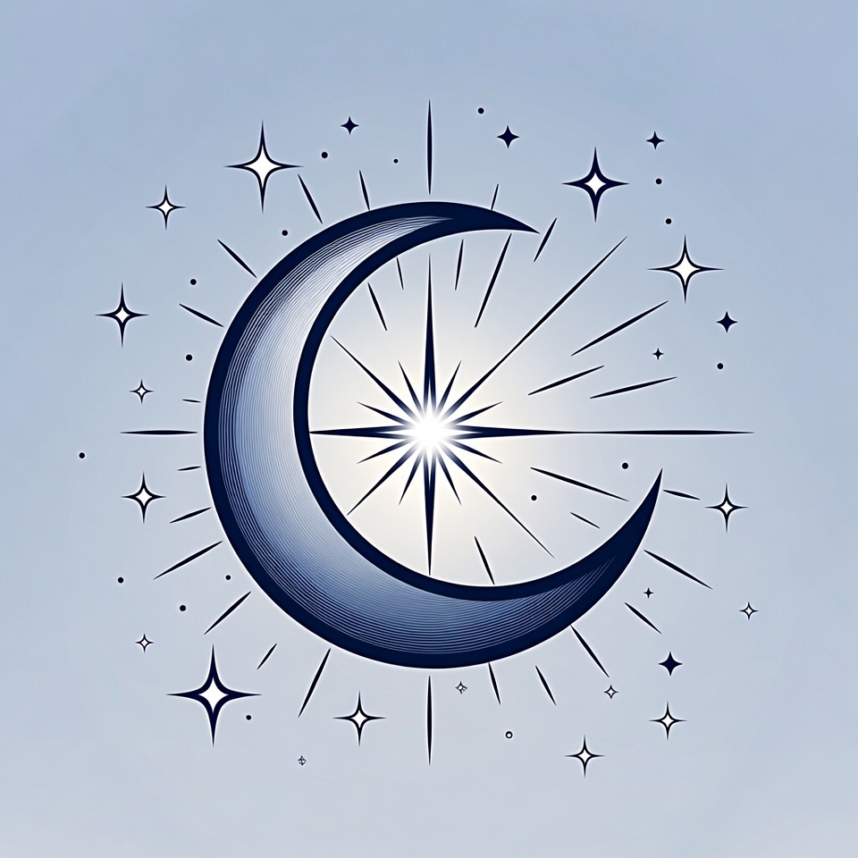 A detailed illustration of a glowing crescent moon surrounded by sparkling stars and radiating rays on a light blue background. The moon features a bright starburst at its center, with intricate line art emphasizing the celestial design. The artwork has a mystical, hand-drawn style.