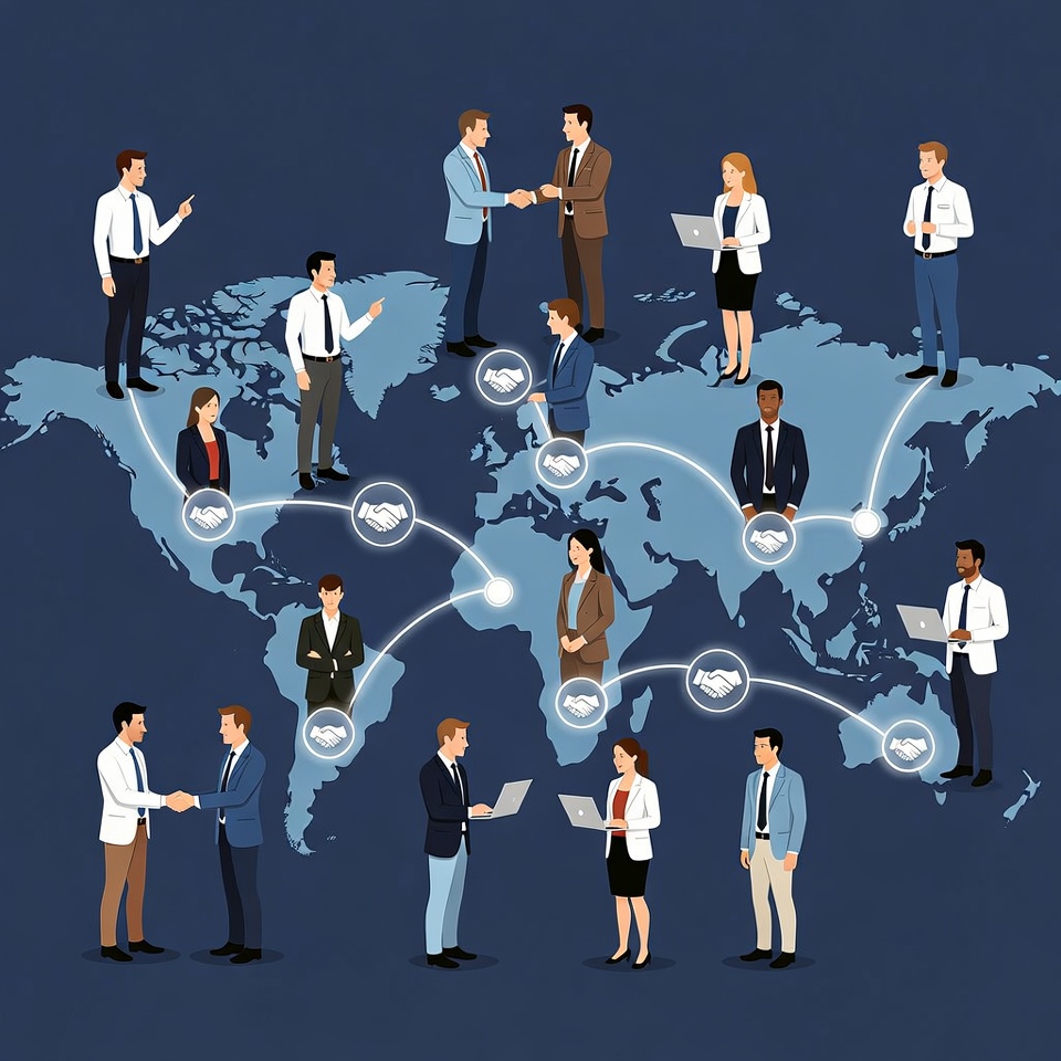Illustration of diverse business professionals in suits shaking hands and holding laptops around a world map. Glowing handshake icons and connection lines link the figures across continents. The vector art features men and women of various ethnicities on a dark blue background.