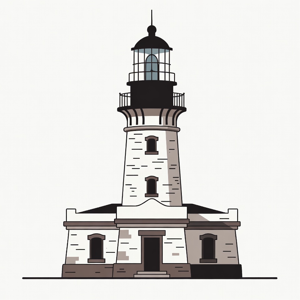 architecture, balcony, beacon, black white, clipart, coast, door, drawing, illustration, isolated, lantern room, line art, maritime, nautical, sea, stone building, tall structure, tower, vector, white background, windows, lighthouse