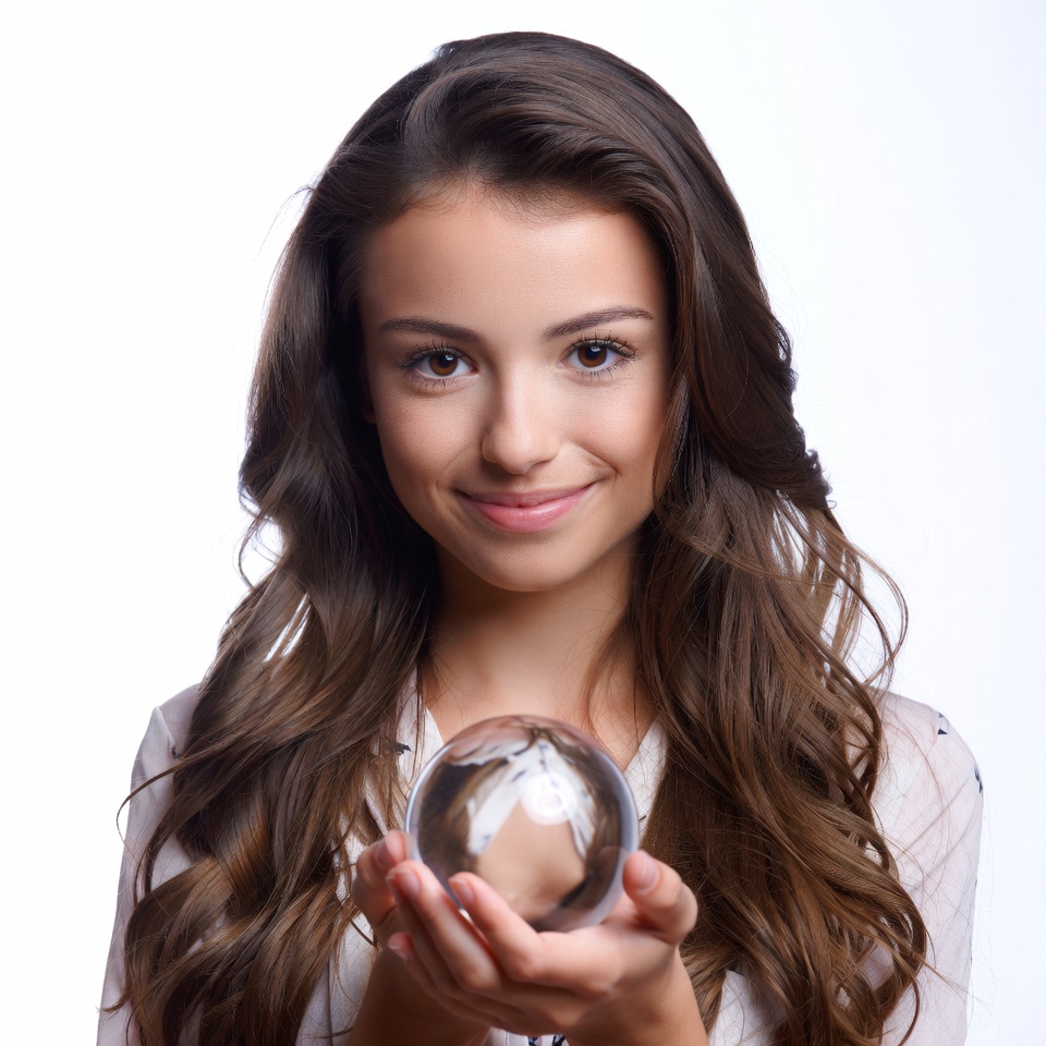 A young woman with long wavy brown hair smiles while holding a clear crystal ball with both hands. She wears a white blouse and stands against a plain white background. Her brown eyes gaze forward engagingly.