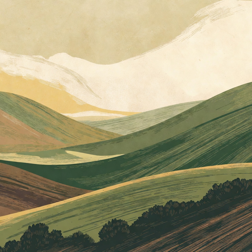 An abstract illustration depicts rolling hills in vibrant shades of green, yellow, and brown. Layered mountains rise in the background under a pale sky with soft white clouds. Dark bushes dot the foreground against the undulating terrain.