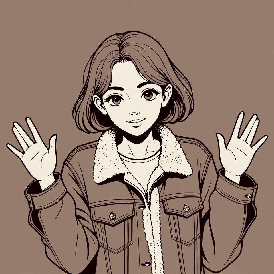 Asian, bob haircut, brown hair, brown jacket, clipart, cute girl, denim jacket, excited pose, fur collar, hands raised, illustration, isolated background, large eyes, line art, manga style, palms out, smiling, white shirt, woman, young woman, anime girl
