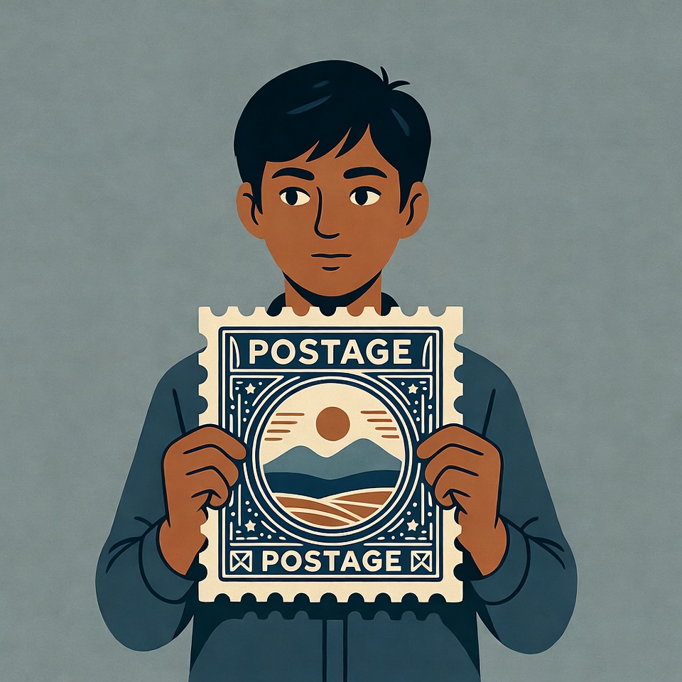 Asian, blue shirt, fields, gray background, holding stamp, illustration, isolated background, male, mountains, ornate border, postage stamp, short hair, stamp design, sun, vector art, vintage stamp, young man