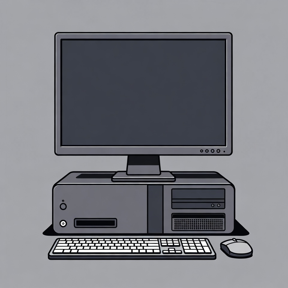 PC tower, clipart, computer setup, desktop computer, flat design, illustration, isolated background, keyboard, line art, monitor, mouse, office equipment, technology, vector graphic, computer