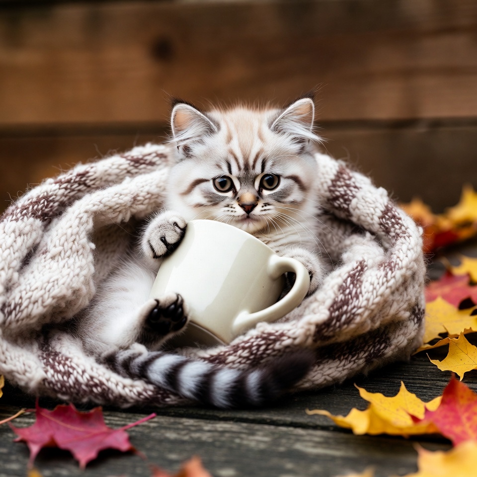 A fluffy British Shorthair kitten with light fur and stripes holds a white ceramic cup with its paws. It is wrapped in a thick beige knitted blanket surrounded by scattered yellow autumn leaves. The scene is set on a wooden surface with a rustic background.