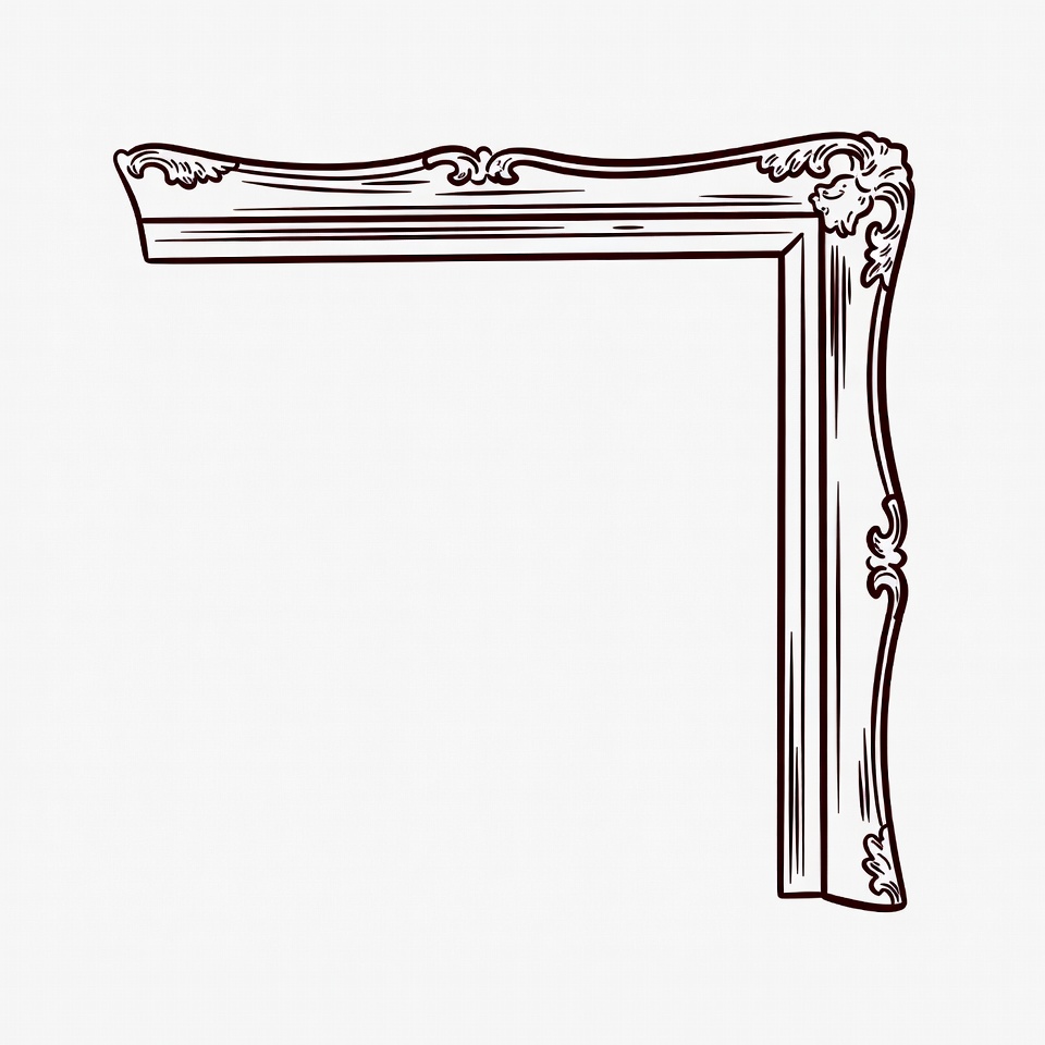A detailed line art illustration of an ornate picture frame corner. The frame features intricate scrollwork and curved designs in a brownish outline style. It is isolated on a white background.