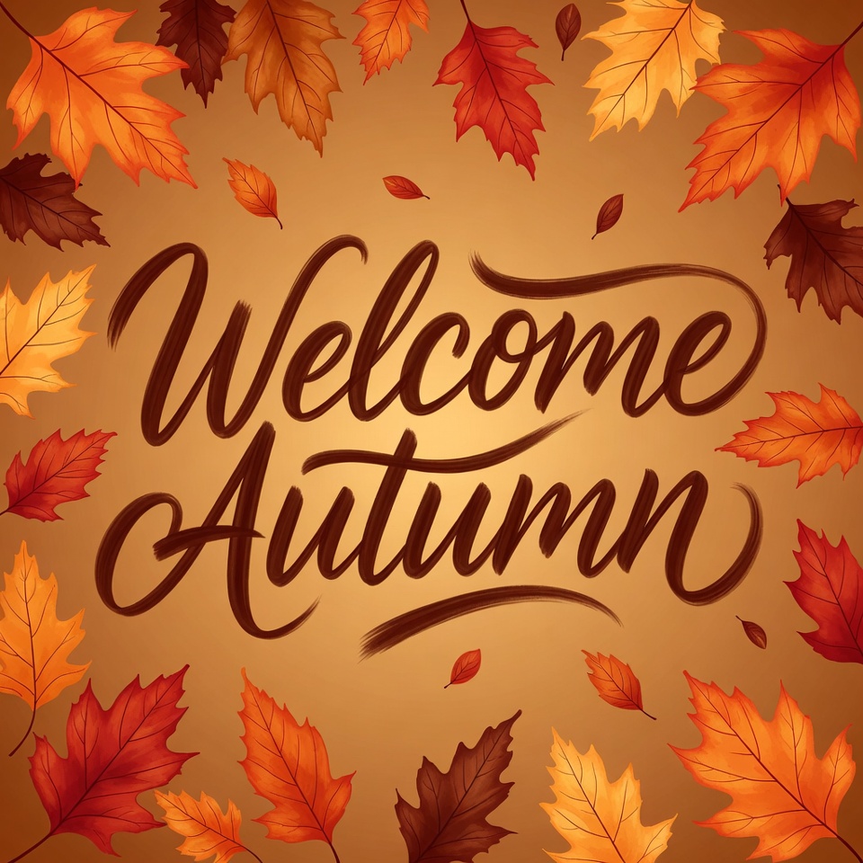 A digital illustration features the words 'Welcome Autumn' in elegant brown cursive script centered on a beige background. Vibrant orange, red, and brown autumn leaves are scattered abundantly around the text. The design has a festive fall theme with a subtle gradient backdrop.