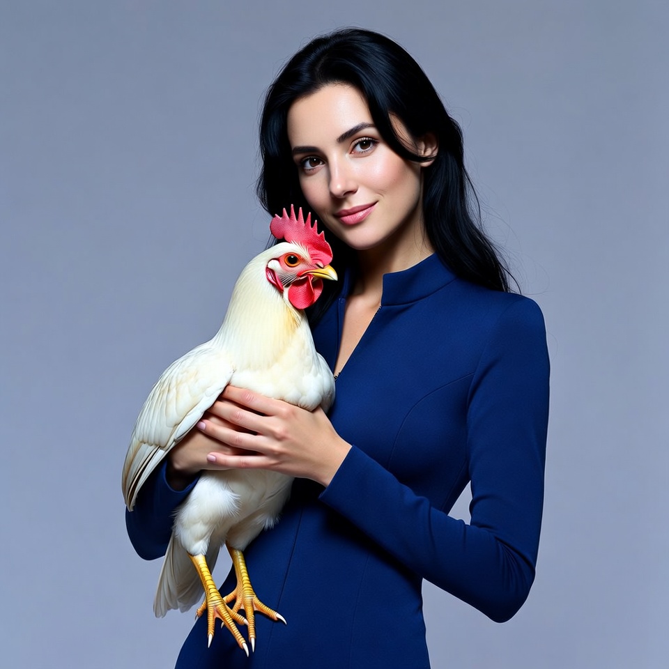 A beautiful woman with long black hair holds a white chicken gently in her arms against a gray background. She wears a sleek blue dress with a high collar and smiles softly at the camera. The chicken has a bright red comb and looks directly forward.