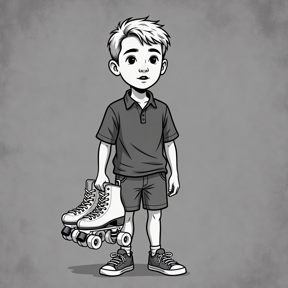 A cartoon boy with blonde hair stands on a gray background holding a pair of white roller skates in his hands. He wears a short-sleeved polo shirt, shorts, and sneakers. The illustration is in black and white line art style with subtle shading.