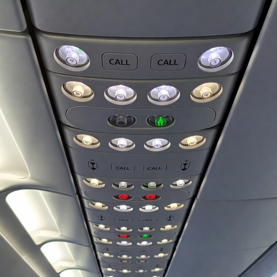 aircraft interior, aircraft panel, airplane controls, aviation, cabin ceiling, call button, call light, flight attendant button, green light, illuminated buttons, light panel, overhead panel, passenger call, red light, white light, airplane