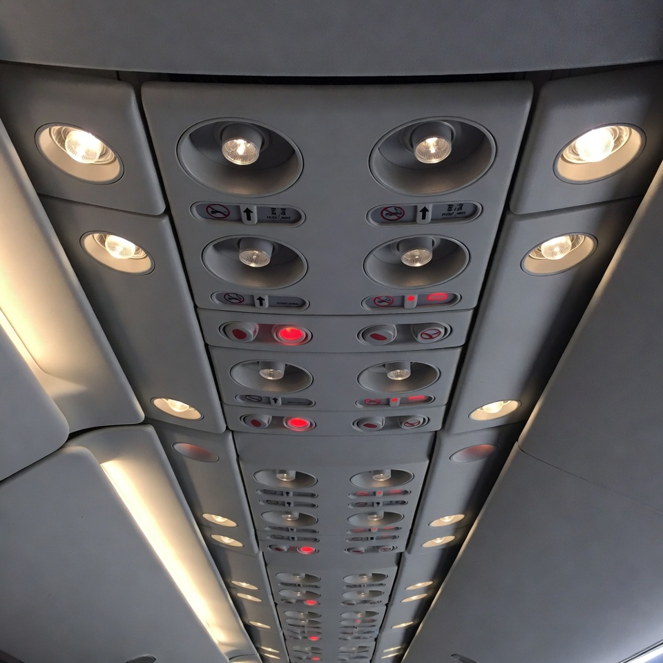air vents, aircraft interior, airplane panels, aviation, buttons, cabin, call buttons, ceiling, flying, fuselage, gray panels, illumination, interior, lights, overhead, overhead lights, passenger cabin, reading lights, red lights, travel, vents, airplane