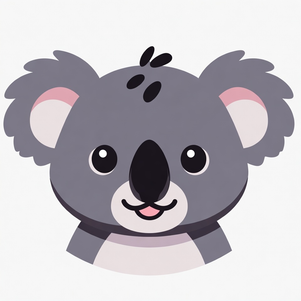 A cute cartoon koala face with fluffy gray fur, large black eyes, and a small smiling mouth. It features prominent rounded ears and tufts of fur on top of the head. The illustration is set against a plain white background.
