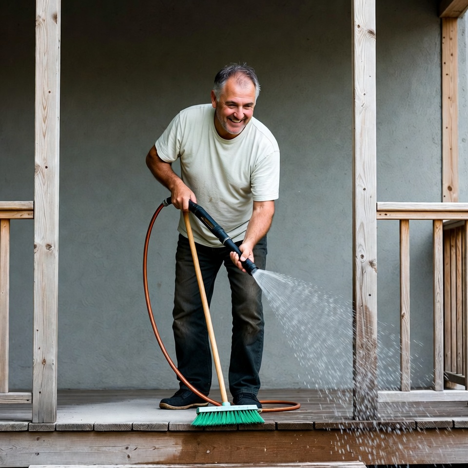 A middle-aged man with short graying hair smiles while cleaning a wooden porch. He wears a light t-shirt, khaki pants, and sneakers, holding a green broom in one hand and spraying water from a black hose in the other. Water sprays across the porch deck surrounded by wooden posts.